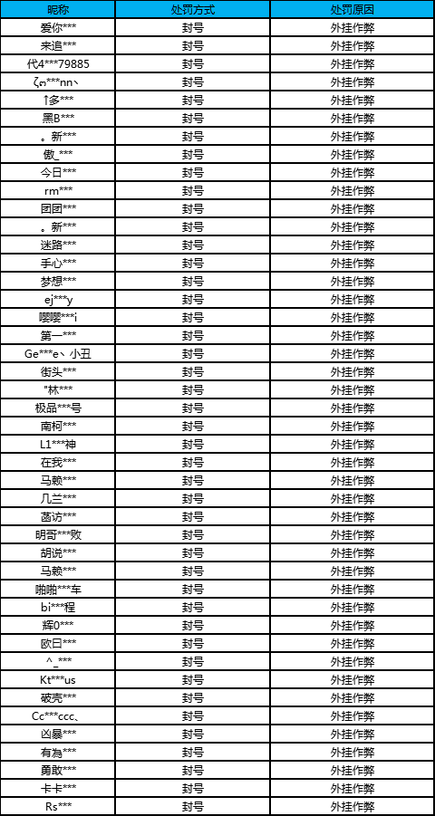 巡查发现并核实,以下玩家存在违规行为,现公布处罚名单:
