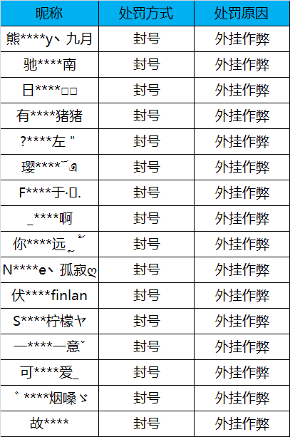 巡查发现并核实,以下玩家存在违规行为,现公布处罚名单: