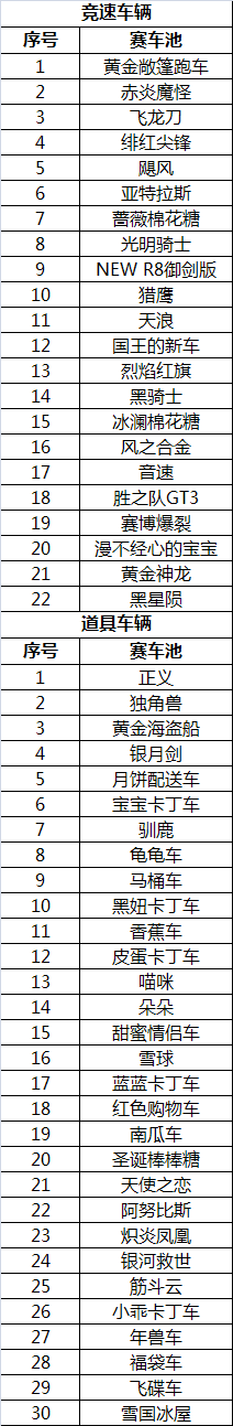 组队道具及组队竞速赛赛车使用规则:同队4人在官方指定车库中选择4款不同车型赛车使用。