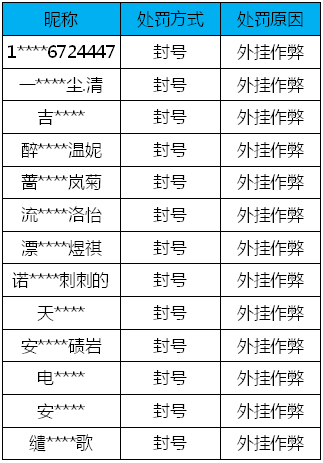 巡查发现并核实,以下玩家存在违规行为,现公布处罚名单: