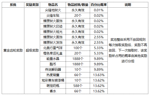 10.黄金齿轮系统中全部奖励内容以及抽取概率公示如下: