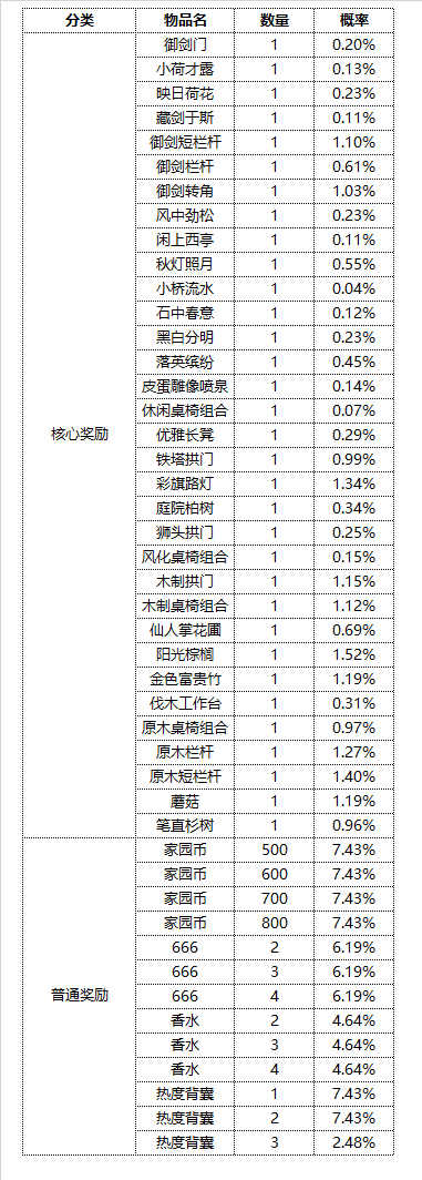 为了给大家带来更好的游戏体验,现将游戏内各类活动以及道具中的核心奖励获得概率进行公示,具体如下: