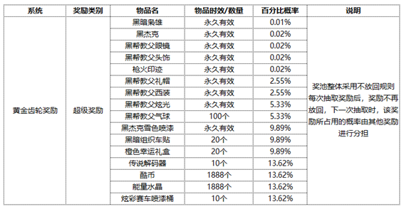 8.齿轮奖励与超级奖励为两个互相独立的奖池,玩家如果获得了全部超级奖励以后,依然可以启动齿轮获得黄金齿轮内的奖励,此时,不再获得超级奖励,请注意