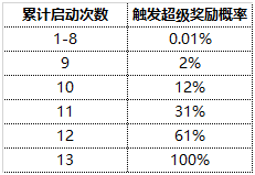 3.每次启动黄金齿轮需要消耗1个炽金启动器,启动后可随机获得齿轮内的奖励。除此之外,玩家使用这种方式启动齿轮时,系统会统计玩家当前已累计的启动次数,依据累计启动次数的不同,按照如下概率进行随机判定,决定玩家是否还可额外触发转动超级奖励的机会。如果成功触发,则额外获赠1次转动超级奖励的机会,并将已累计的启动次数重置为0重新开始计算,如果没有触发,那么就继续累计,直至成功触发为止;