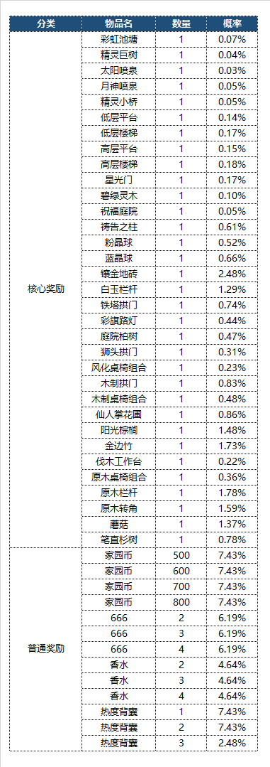 为了给大家带来更好的游戏体验,现将游戏内各类活动以及道具中的核心奖励获得概率进行公示,具体如下: