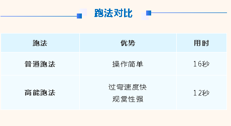 本张图的核心难点之一就在赛道前端的连续弯道中,这段赛道由连续U型弯道和近道组成,现在就和宝宝一起看一下这段路的普通跑法和高能跑法吧!
