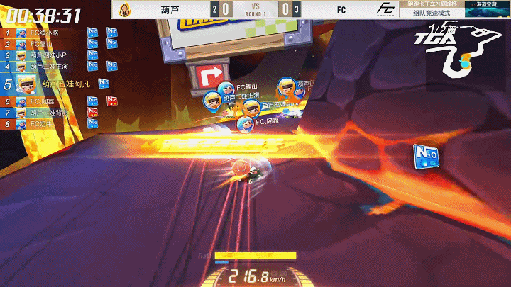 组队竞速赛第一盘比赛,首张地图还是我们的老朋友迪拜富人区,葫芦几乎全段都占据上风,FC虽然不断追击但还是无济于事,最后以葫芦小P冲线宣告葫芦的胜利,拿下全局首个比分。第二张地图街头狂飙,FC的阿鑫和奶牛前半段几乎一直领跑,却没想到在最后被葫芦阿凡反超,葫芦以一分之差险胜,比分2:0领先。第三局的万里长城,FC阿鑫一骑绝尘,展现出强大的个人能力,为FC战队扳回一分。第四局的森林发夹还是FC阿鑫一直领跑,再加上靠山奶牛的完美发挥,小比分直接追到2:2平局。第五局龙之西湖,FC战队几乎全员第一梯队,葫芦战队没有太多机会,FC让2追3率先到达赛点局。赛点局海盗宝藏,本来葫芦战队优势很大,却没想到在岩浆区域两人掉坑,这个重大的失误让葫芦战队断送好局,FC战队第一局比赛让2追4大比分1:0领先。