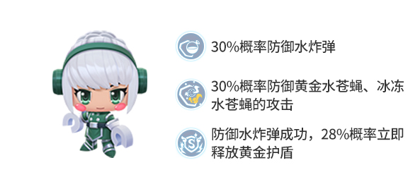 而且在你穿过对手布下的水炸弹时,满级的卡洛儿有55%的概率帮助你防御水炸弹,而当防御水炸弹成功后,卡尔儿有40%概率立即释放出黄金护盾,为你胜利的前进之路保驾护航哦!