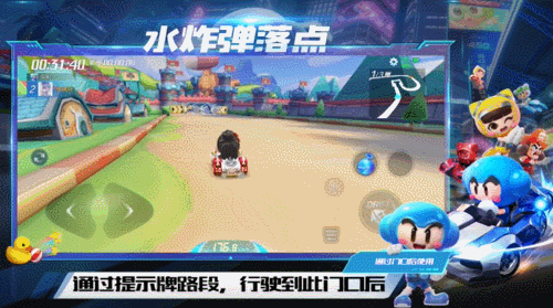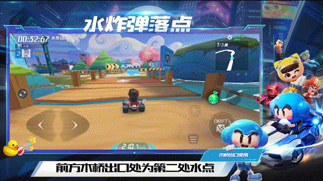 离开旋转木马路段,通过提示牌道路,在提示牌尽头前有一个道具带,这个道具带就是最后一处水点位置啦!车友们在接触道具带时使用水炸弹,可以攻击到终点线前的对手。
