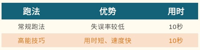 通过对比可以发现,高能技巧是在普通跑法的基础上增加了断漂补气和落地集气等操作,这些连续的高能技巧不但可以缩短跑图时间,在氮气上也更加具有优势。
