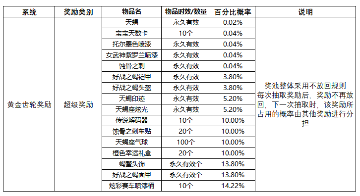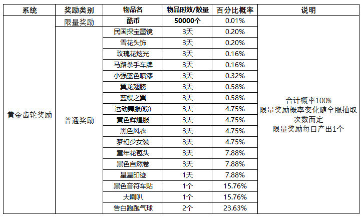 10.黄金齿轮系统中全部奖励内容以及抽取概率公示如下: