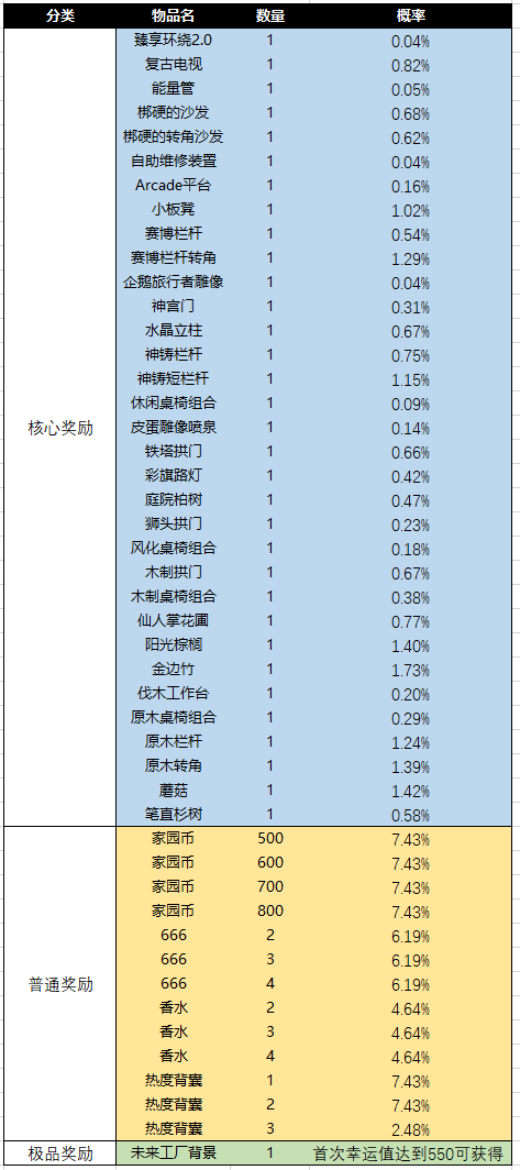 5.玩家幸运值达到550的当次抽取,所抽出的物品必定为【未来工厂背景】;