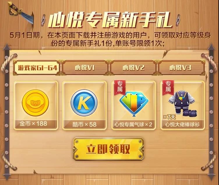 4、5月1日起,在本页面下载并注册游戏的用户,可领取对应等级身份的专属新手礼1份,单账号限领1次;