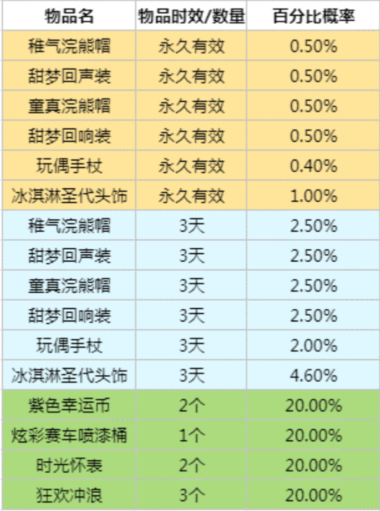 3.礼盒内各物品道具的获取概率如下所示: