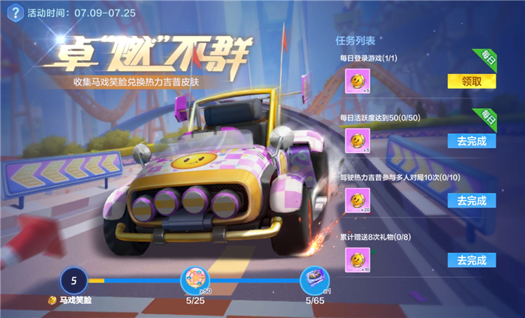 7月9日-7月25日,参加卓“燃”不群活动,通过完成任务来收集马戏笑脸,达到指定数量即可兑换热力吉普的全新皮肤!