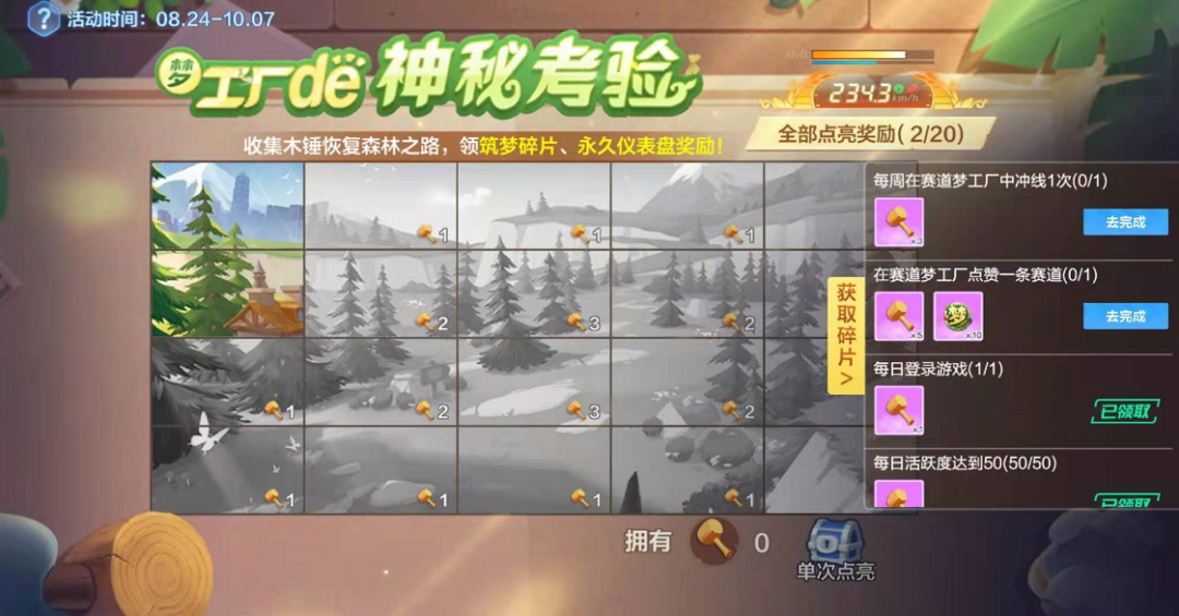 8月24日-10月7日,参与“赛道梦工厂”模式比赛,完成活动任务即可获得“森林木槌”,使用木槌恢复森林之路,将能获得筑梦碎片,奇幻森林仪表盘等丰富奖励。