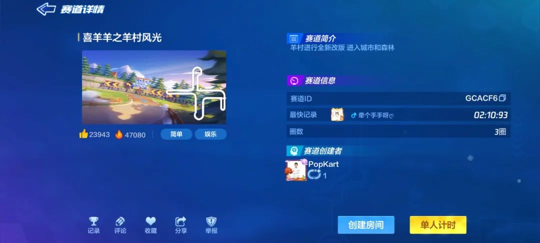 喜羊羊之羊村风光是一个有着童年回忆的赛道名字,赛道结合了城市和乡村风格,有着不同的生活气息。赛道难度中等,适合喜欢休闲跑图的车友噢。