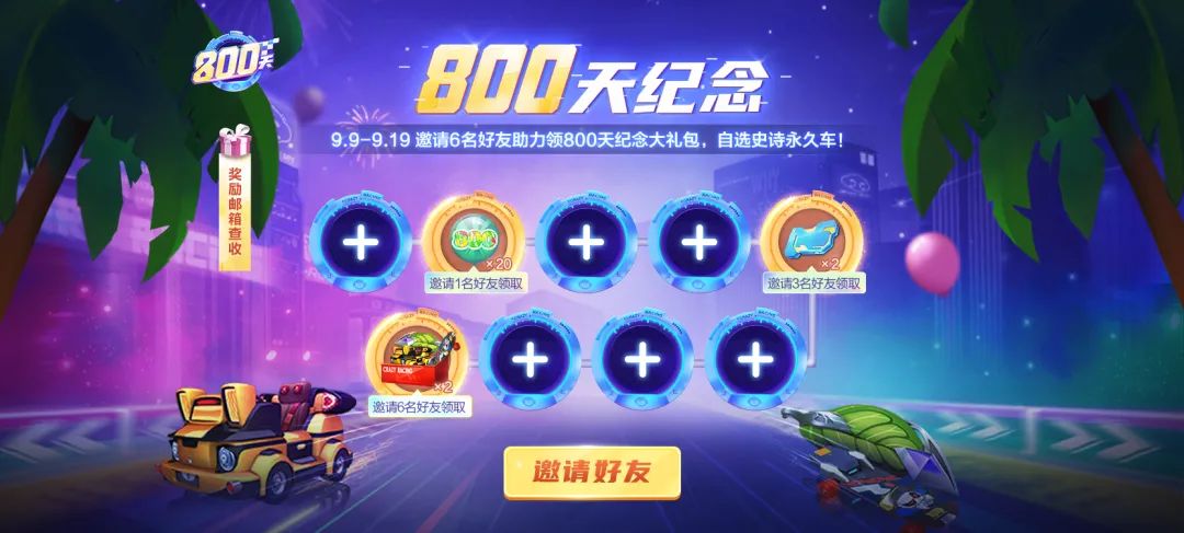 在9月9日-9月19日期间,车友们邀请6名好友助力领800天纪念大礼包,即可自选永久史诗车!
