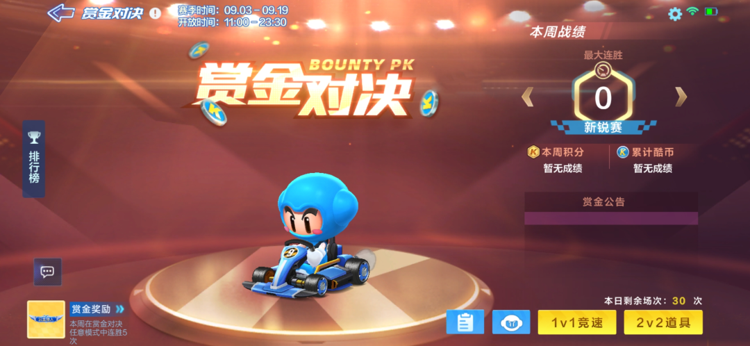 开放时间:赏金对决将于9月3日-9月19日限时开放,每日开放时间为11:00-23:30,车友们敬请期待噢!