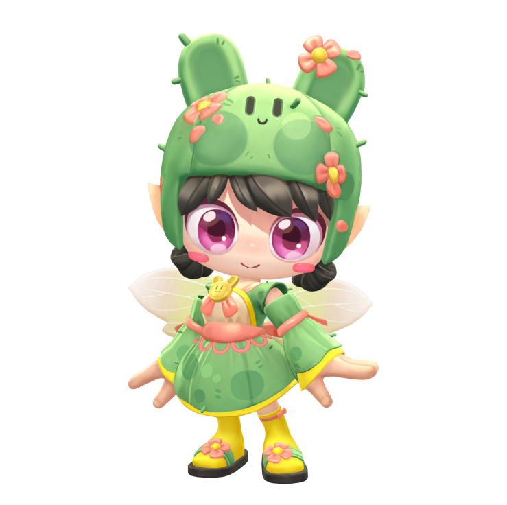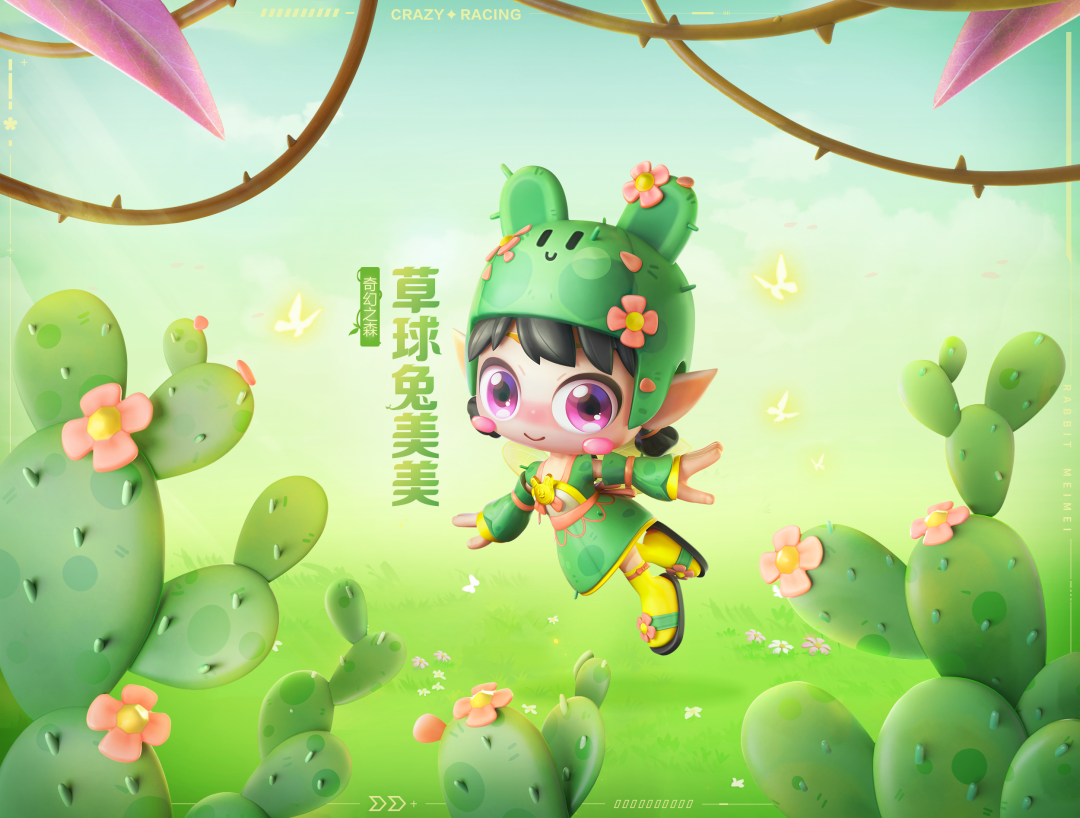 草球兔美美喜欢扎两个小辫子,头戴仙人球兔兔并喜欢用花朵装饰,身穿绿色蓬蓬裙惹人喜欢。她经常展开翅膀穿梭在仙人掌附近,喜欢用热心去帮助每一个人。