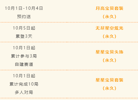 在10月1日-10月21日期间,车友们完成累登和任务即可获得月亮宝贝套装和星星宝贝套装。其中,在10月1日-10月4日期间需要预约才可以获得月亮宝贝套装,在10月5日起需完成任务就可以获得星星宝贝套装和无尽星空炫光。
