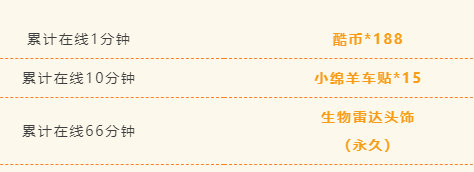 在9月19日-9月21日期间,车友们累计在线一定的时间,即可获得小绵羊车贴和生物雷达头饰。