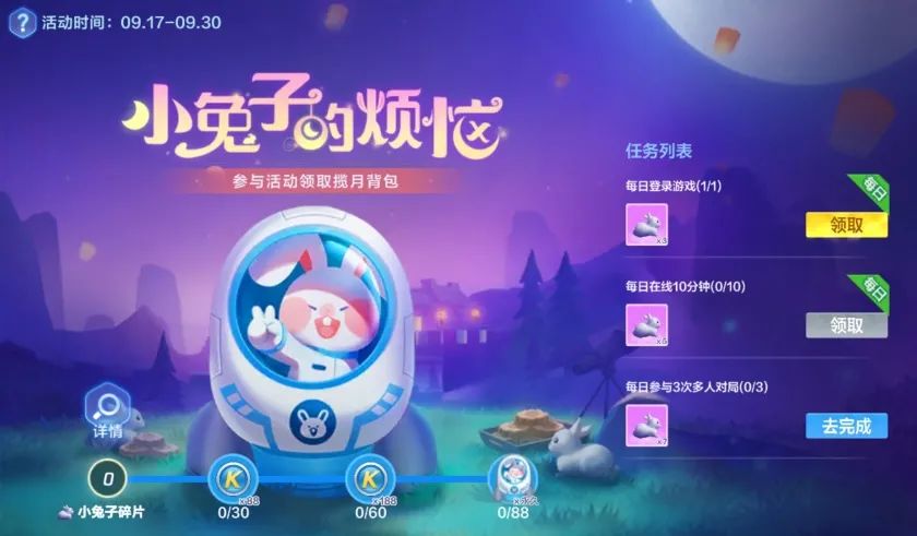 在9月17日-9月30日期间,车友们完成每日任务即可获取小兔子碎片,集齐88个小兔子碎片就可以兑换永久揽月背包。快来收集碎片为兔兔修复背包吧!