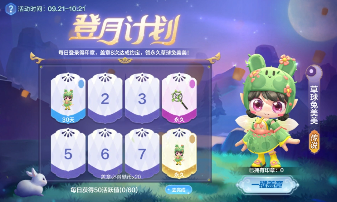 在9月21日-10月21日期间,车友们通过每日登录获得印章,盖章后必得酷币*20,完成盖章8次即可达成约定,就可以领取永久传说车手草球兔美美!