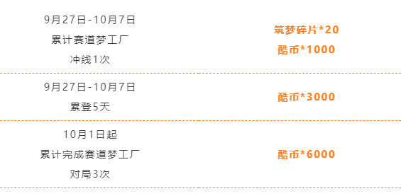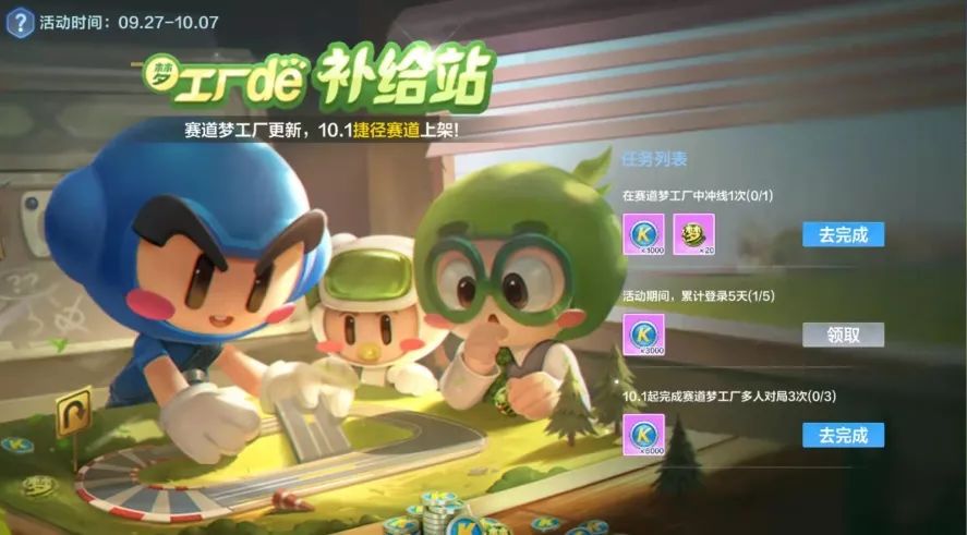 赛道梦工厂精选更新!在9月27日-10月7日期间,车友们完成指定任务即可获得电池,筑梦碎片和酷币奖励!