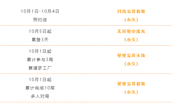 在10月1日-10月21日期间,车友们完成累登和任务即可获得月亮宝贝套装和星星宝贝套装。其中,在10月1日-10月4日期间需要预约才可以获得月亮宝贝套装,在10月5日起需完成任务或累登就可以获得星星宝贝套装和无尽星空炫光。