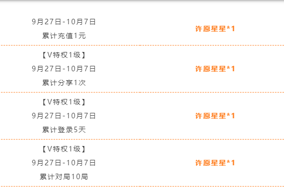 在9月27日-10月7日期间,完成指定任务可领取许愿星星,一共可获得4次。10月1日起开始瓜分,就有机会获得永久传说车以及其他奖励哦!