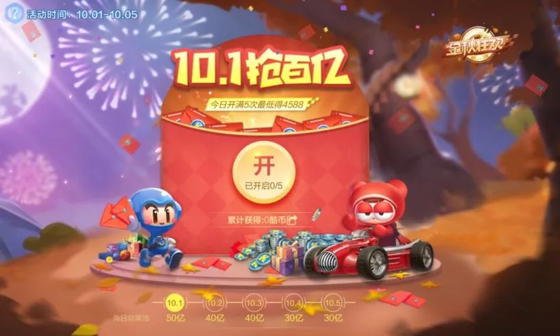 在10月1日-10月5日期间登录游戏,每天会有5次开红包机会,车友们开启后将随机获得不同金额酷币。