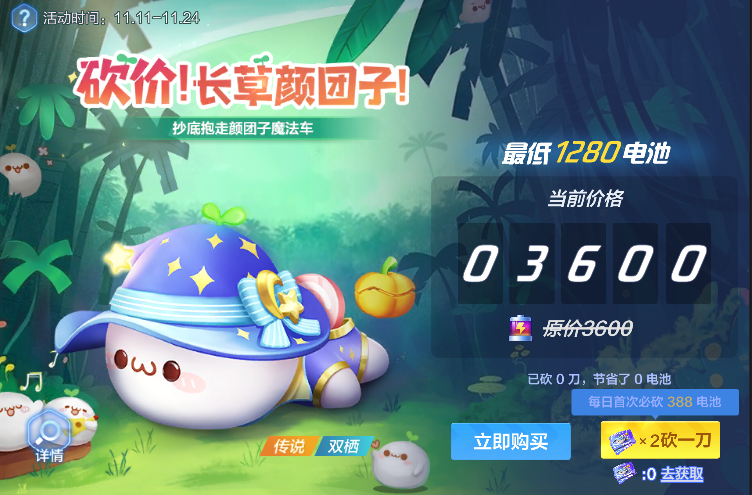 来到繁荣山丘的伙伴都有一个车神梦,在11月11日-11月24日期间,车友们可以通过每日登陆和对局获得砍价券,消耗砍价券可降低永久双栖车“颜团子魔法车”所需电池,每日首次必砍388电池,此后每次可砍108-408电池,快来和团子一起追梦吧!