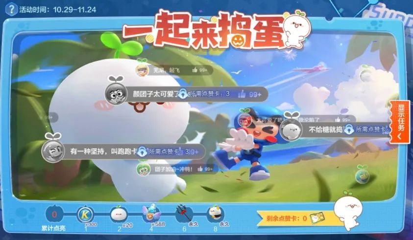 在10月29日-11月24日期间,完成每日任务即可领取点赞卡,点赞卡可用于点亮弹幕,每消耗3张点赞卡可点亮1条弹幕,弹幕需要顺序点亮,点亮弹幕数量达到指定进度即可领取对应奖励。
