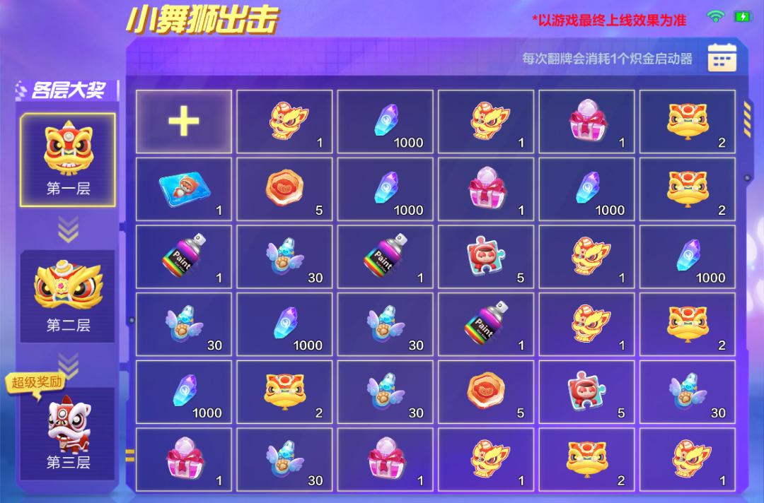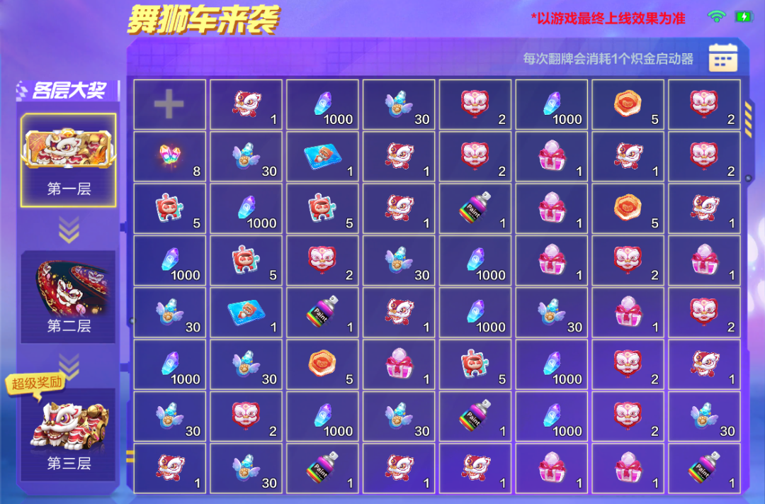 2.每次消耗1个炽金启动器可翻开1张牌子,获得随机奖励;当翻到大奖时,除了获得大奖外,本层剩余未翻开的奖励会全部赠送,并进入到下一层。谁才是本期幸运翻翻乐的欧皇呢~快来试试自己的手气吧!