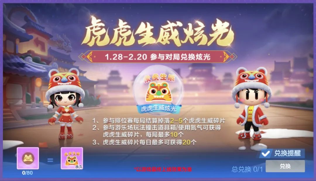 1月28日-2月20日,活动中心将开启【虎年大吉】虎虎生威炫光活动,参与对局收集80个虎虎生威碎片即可兑换虎虎生威炫光!