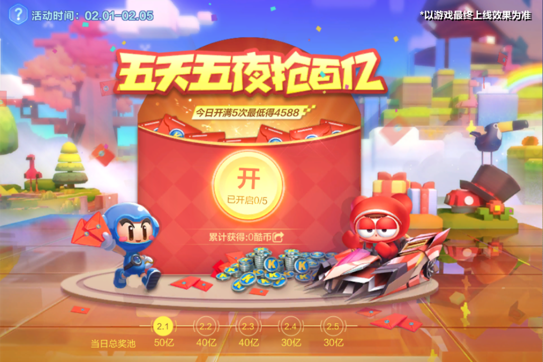 2月1日-2月5日,福利站将开启抢百亿酷币活动,活动期间,每日共有5次开启红包的机会,红包开启后将随机获得不同额度的酷币。另外每天开启红包时有概率额外获得拼手气红包,具体玩法规则请至游戏内浏览查询!参与活动可获得海量酷币,车友们不要错过喔~