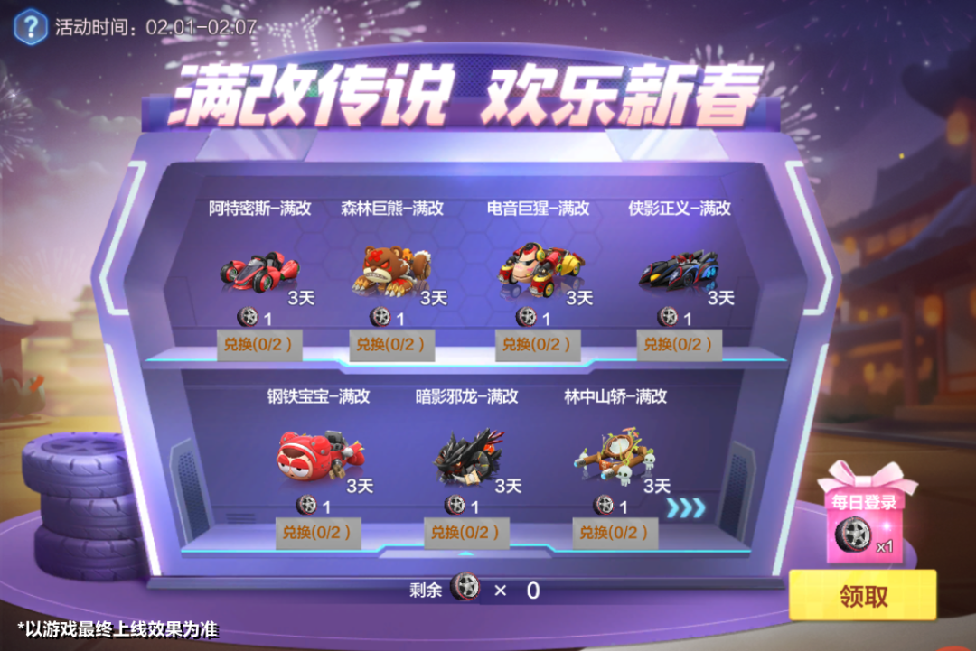 2月1日-2月7日,福利站将开启满改传说车活动,活动期间每日登录游戏即可获得赛车轮胎碎片,玩家可消耗指定数量的赛车轮胎碎片兑换满改传说车。活动结束后,赛车轮胎碎片将会被回收,请车友们注意活动时间噢~