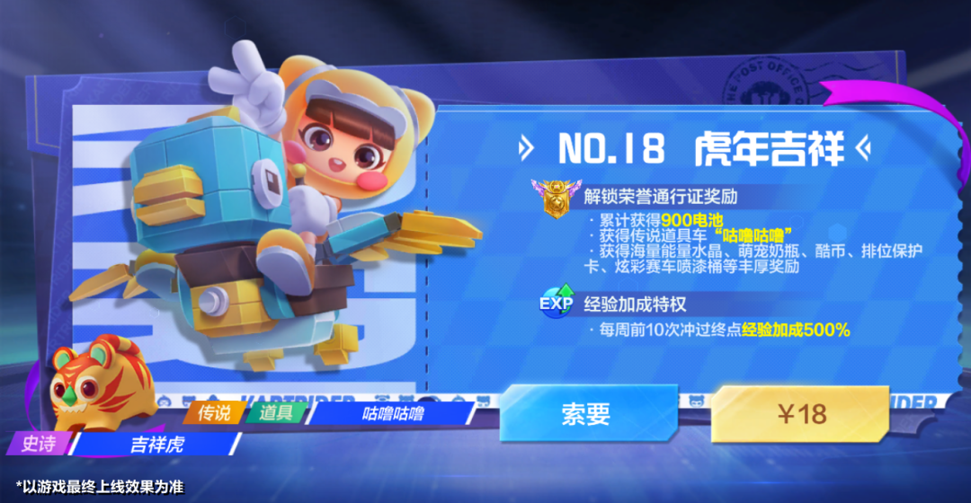NO.18期通行证将于2月1日盛大开启!传说级道具车咕噜咕噜、史诗级宠物吉祥虎,将分别在荣誉通行证和活跃通行证中与大家见面哦~先让糖糖带着它们和大家打个招呼吧~