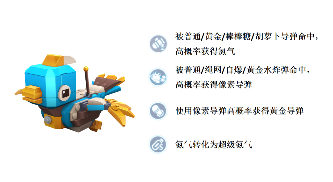 被普通/绳网/自爆/黄金水炸弹命中,高概率获得像素导弹。在被上述几种水炸弹命中时,咕噜咕噜有着强力的应对手段,高概率获得的像素导弹在命中对手后,受击人会被浮空禁锢并在周围形成像素爆炸,范围内的玩家都会被减速!