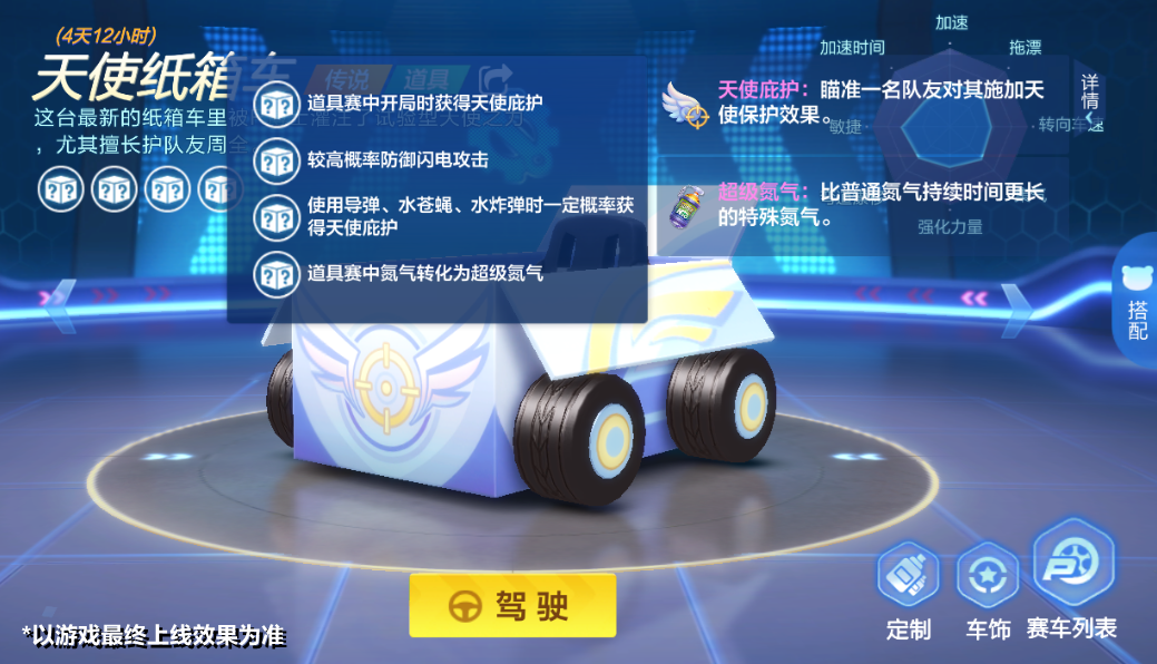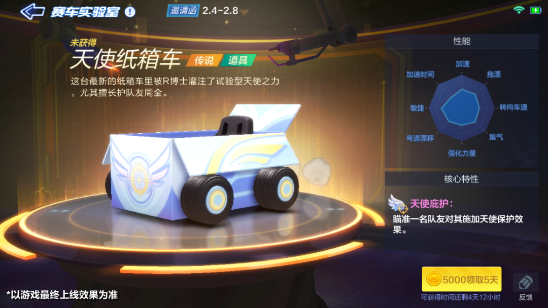 2月4日-2月8日,R博士将在赛车实验室邀请车友们测试最新一代产品,道具类型的传说纸箱车——天使纸箱车!