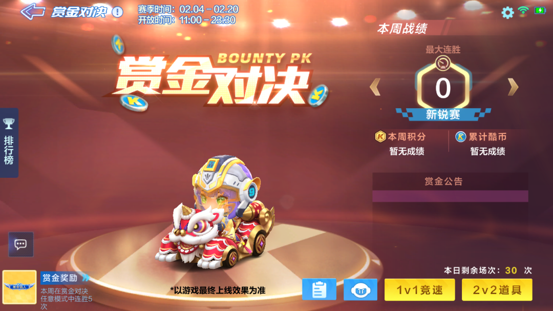 赏金对决将于2月4日-2月20日限时开放,每日开放时间为11:00-23:30,车友们敬请期待~