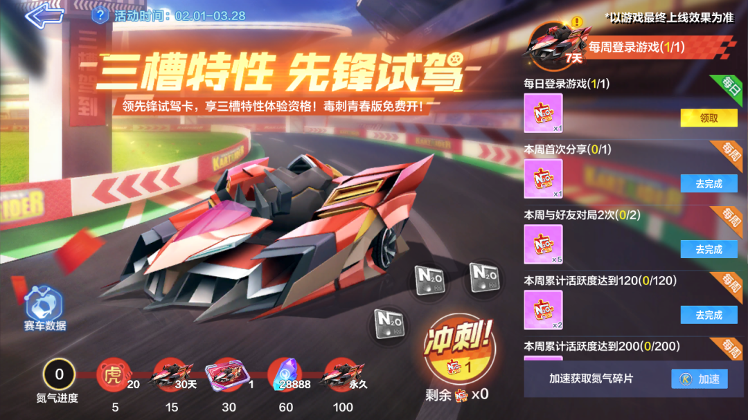 糖糖温馨提示,三槽试驾活动已于今日开启,车友们可完成任务获取三槽先锋试驾券,在活动中心兑换搭载三槽特性的毒刺试验版*30天和三槽体验官称号。全民众测新特性,虎虎生威迎新春!