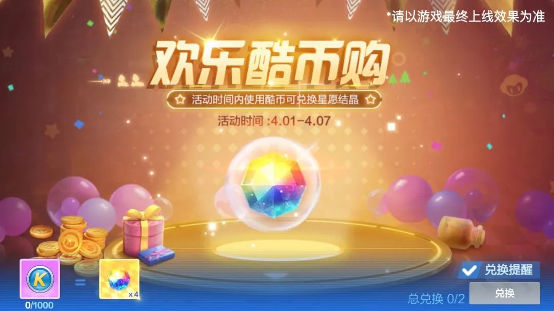 欢乐酷币购,福利享不停。04.01-04.07期间,车友们可以花费酷币*1000兑换星愿结晶*4。