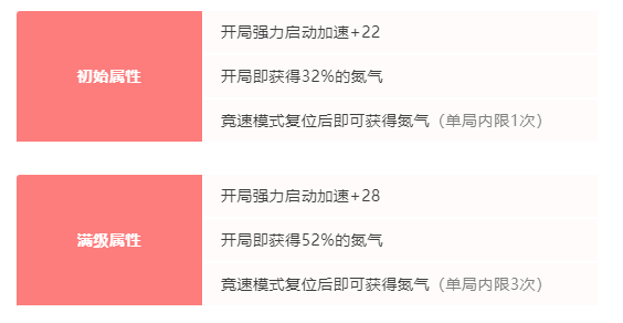 开局获得氮气的效果可以保证赛车在通过第一道弯道之后稳定获得一个氮气,从而保证后续氮气供应充足,对于集气性能差的赛车大有裨益。