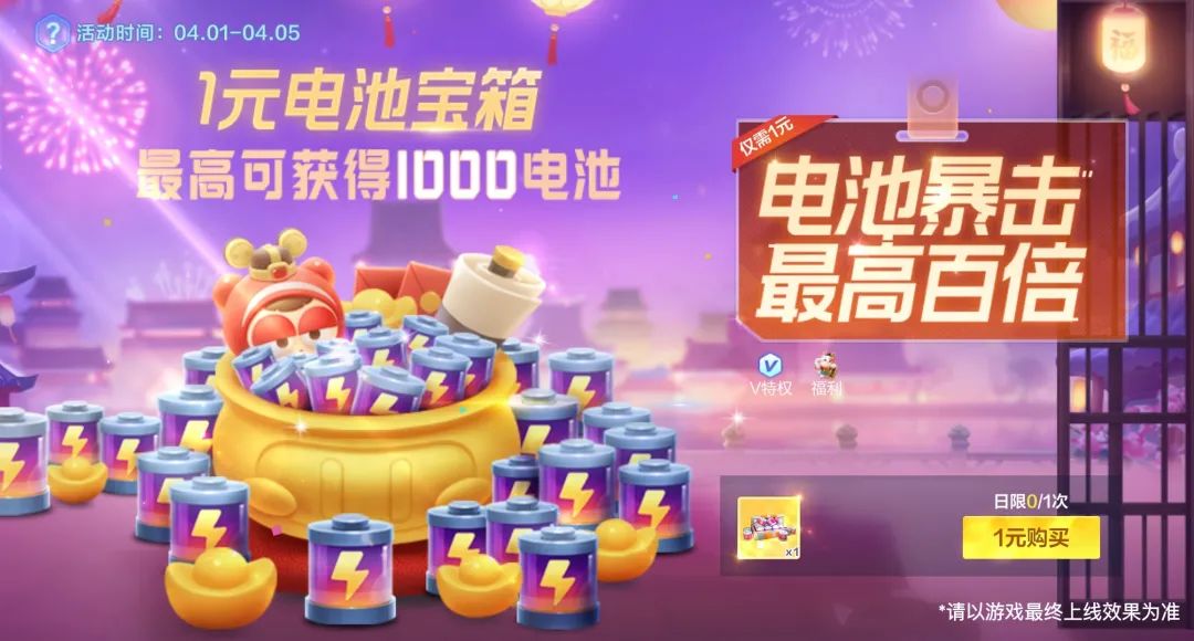 04.01-04.05期间,每天都可以花费1元购买电池宝箱,开启宝箱最高可以获得1000电池!反正宝宝觉得自己是欧皇,宝宝冲锋!