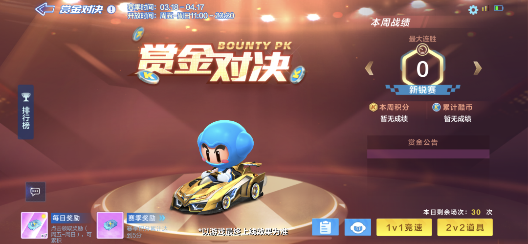 赏金对决将于3月18日开启,开放时间为每周五至周日11:00-23:30,车友们敬请期待~