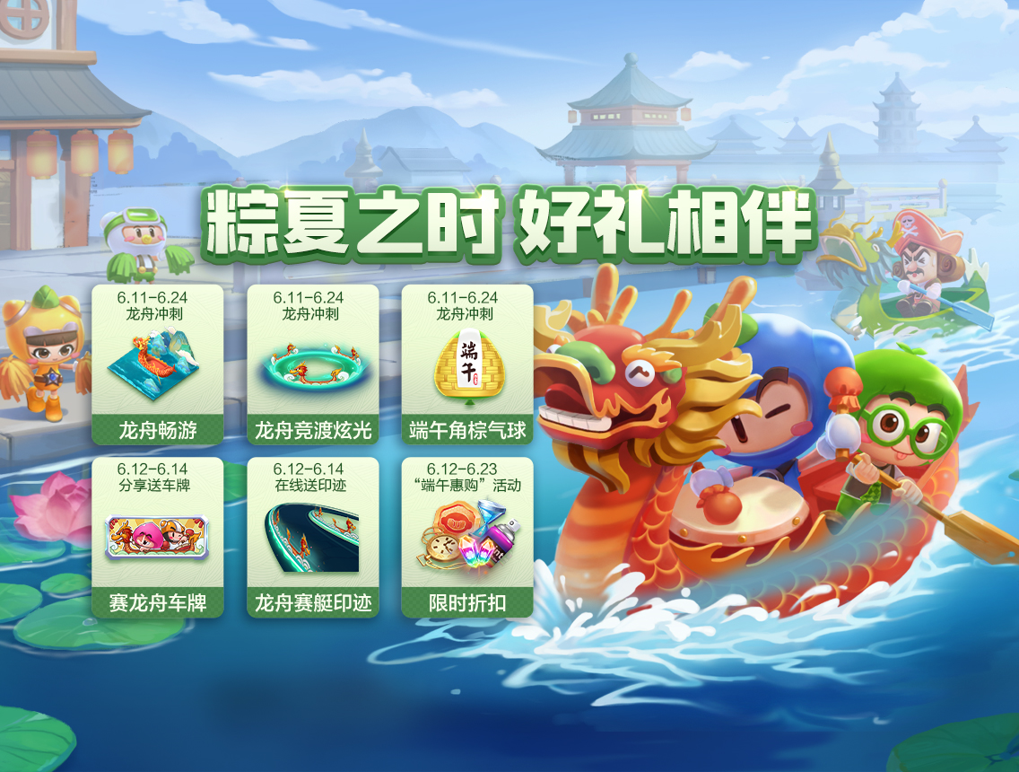 6月11日-6月24日,车友们可前往福利站参与龙舟冲刺活动,龙舟畅游小屋建筑、龙舟竞渡炫光、端午角粽气球免费拿!