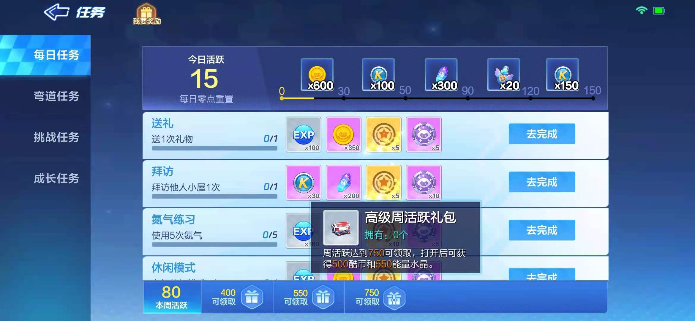 通过完成每日任务,每天都可领取到580酷币,而达到一定活跃度后,每周还可领取三个周活跃礼包,共包含1200酷币。