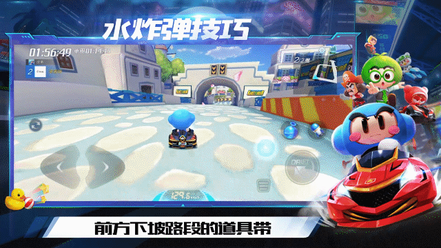继续行驶,前方下坡路段的道具带就是宝宝要给大家分享的第三处水点位置啦,在接触道具带时使用水炸弹,可以攻击到天桥道具带处的对手。